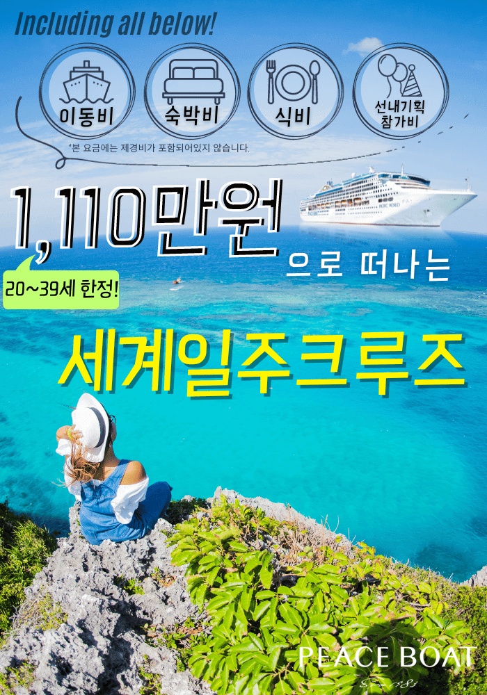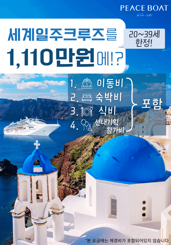 본 "1,110만원으로 떠나는 세계일주"는 2024년 4월 출항 피스보트 제117회 세계일주 크루즈를 대상으로 하며 선착순 접수 11명의 20~39세를 대상으로 진행하는 한정 캠페인입니다.