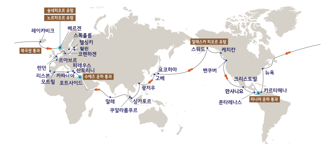 전체 26곳의 기항지 방문, 세계 2대 운하 통과, 그리고 노르웨이와 알래스카의 멋진 피오르 유람까지…