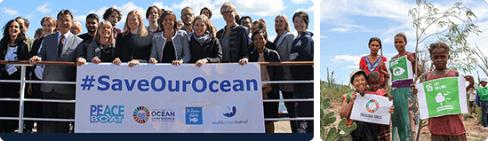 피스보트는 유엔이 설정한 '지속가능한 개발 목표 (Sustainable Development Goals, SDGs)'의 실현을 위해 적극적인 노력을 하는 단체입니다. SDGs는 지구를 보호하고 빈곤을 퇴치하기 위한 행동을 촉구합니다. 피스보트는 캠페인의 적극적인 홍보를 위해 SDGs의 로고와 함께 전 세계를 항해하며, 선내, 그리고 각 기항지에서 진행되는 프로그램은 목표의 실천에 대한 고민을 만듭니다.