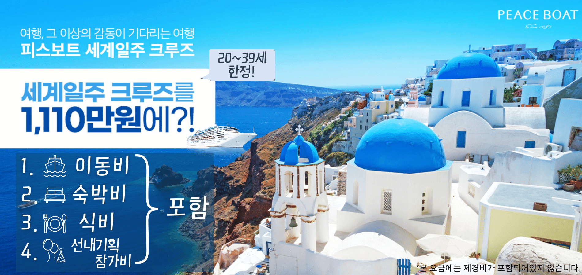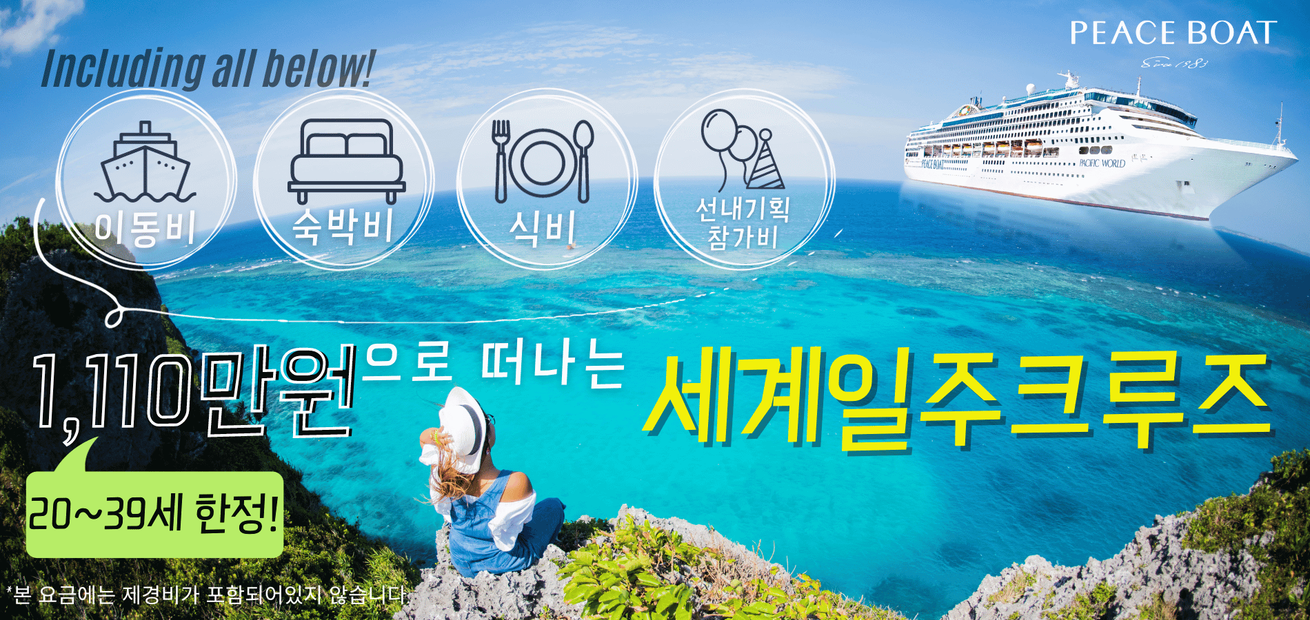 본 "1,110만원으로 떠나는 세계일주"는 2024년 4월 출항 피스보트 제117회 세계일주 크루즈를 대상으로 하며 선착순 접수 11명의 20~39세를 대상으로 진행하는 한정 캠페인입니다.